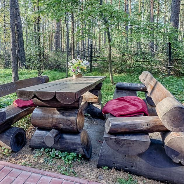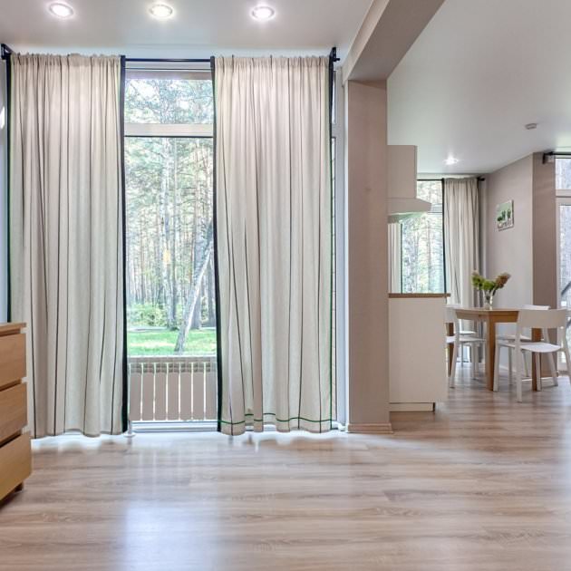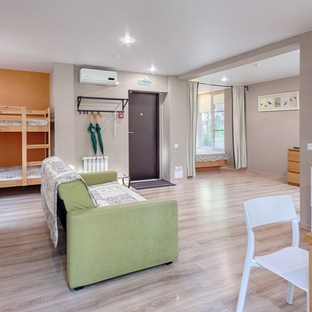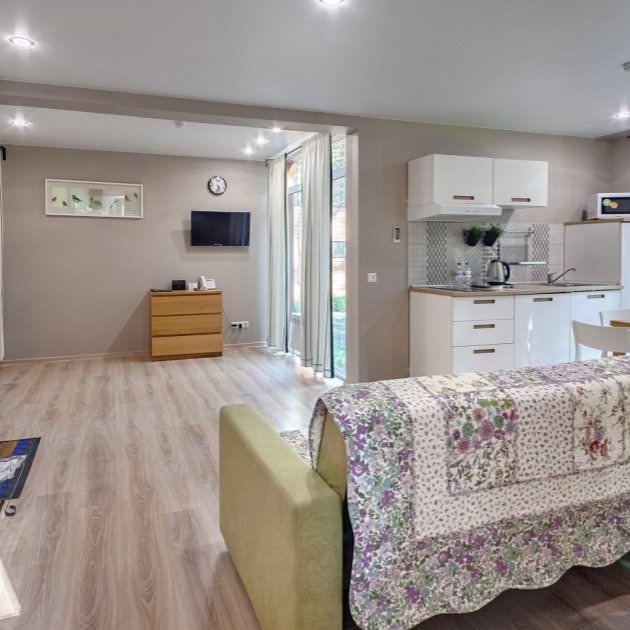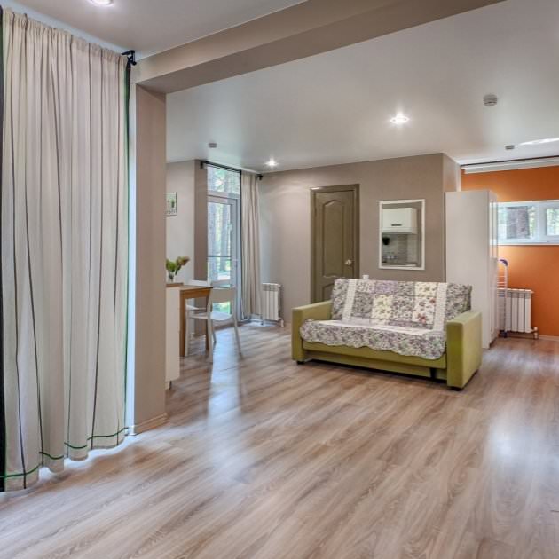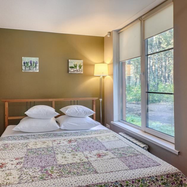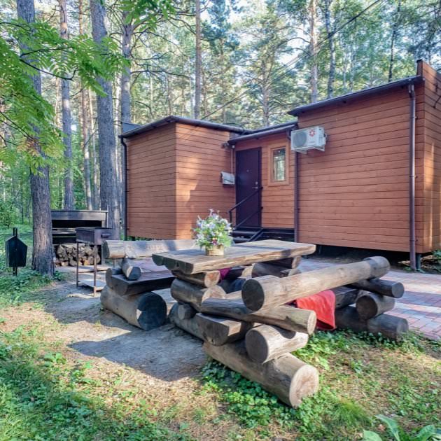 Стильные, современные, благоустроенные дома-студии в лесу с панорамными окнами можно арендовать в санатории. Площадь дома — 45 кв. м, в каждом домике есть оборудованная кухня, спальня, двухъярусная кровать и раскладной диван.