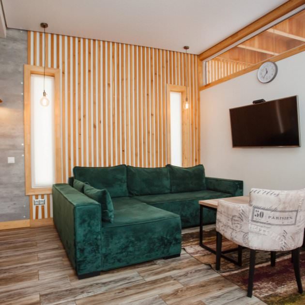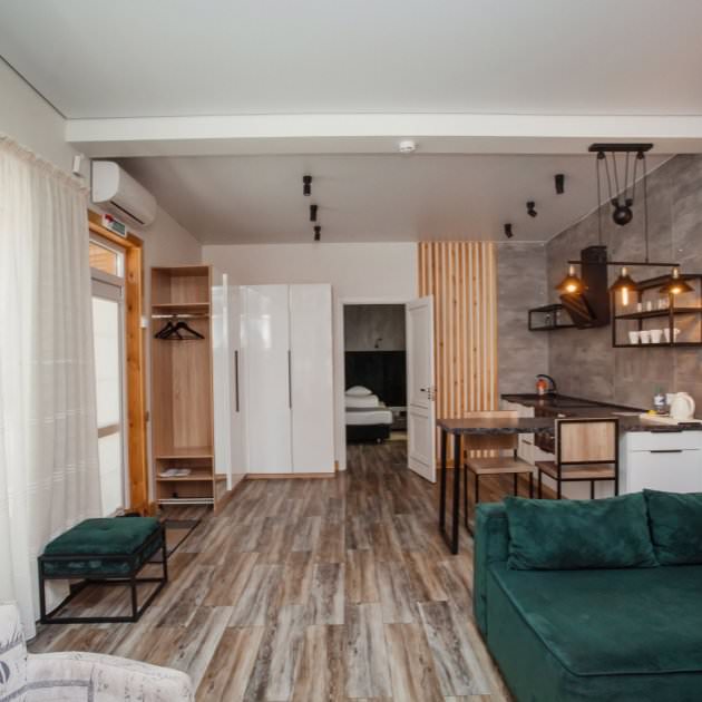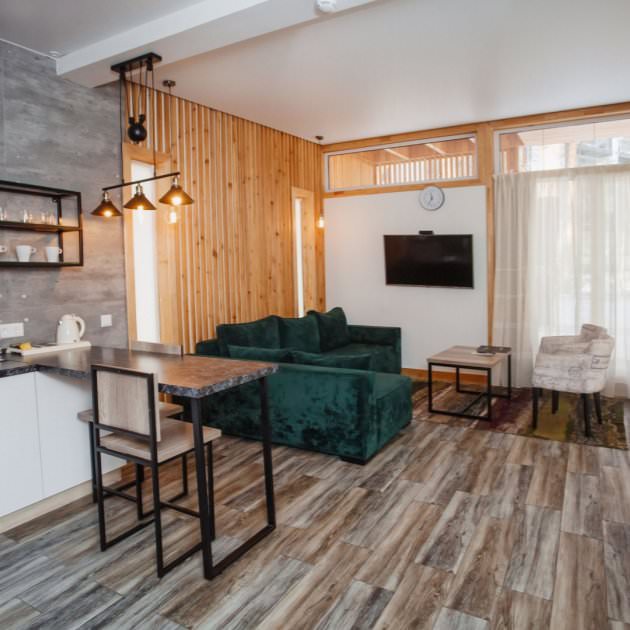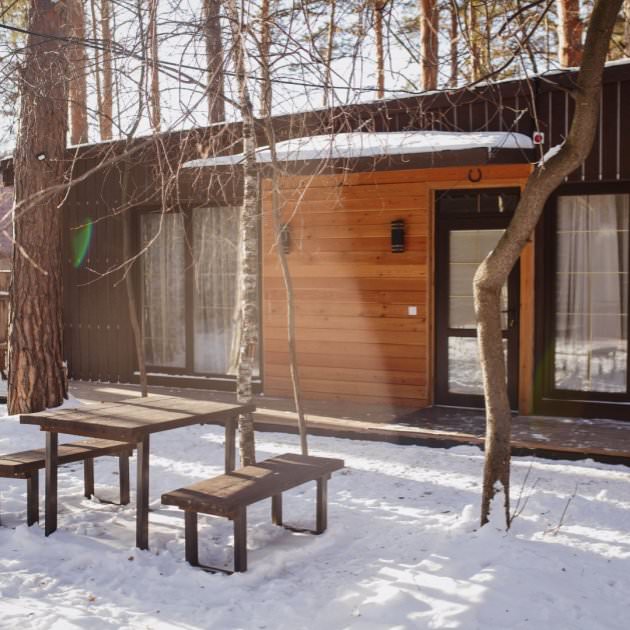 Новые домики Форест Хаус с панорамными окнами. Площадь дома — 48 кв. м, в каждом домике есть мансарда 9 кв. м. оборудованная кухня, спальня, раскладной диван. В домике с комфортом разместится семейная пара 2 взрослых и двое детей.