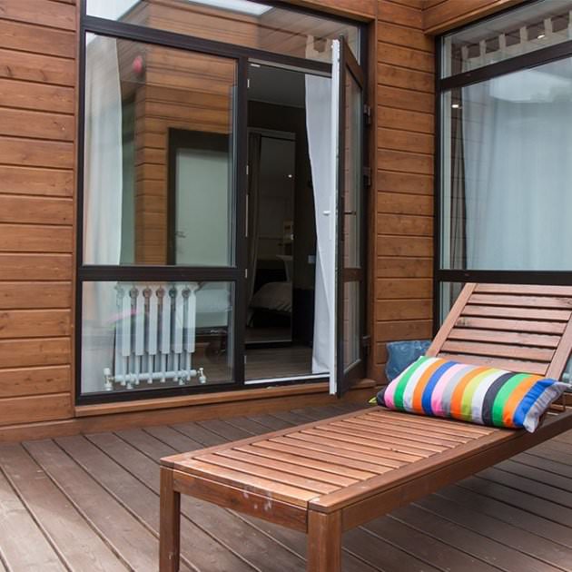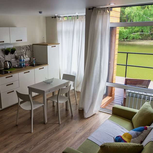 Стильные, современные, благоустроенные дома-студии на реке с панорамными окнами можно арендовать в санатории. Площадь дома — 45 кв. м, в каждом домике есть оборудованная кухня, спальня, двухъярусная кровать и раскладной диван. В домике с комфортом разместится семейная пара 2 взрослых и двое детей.