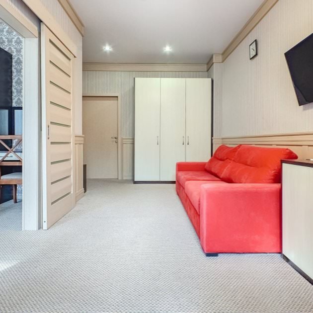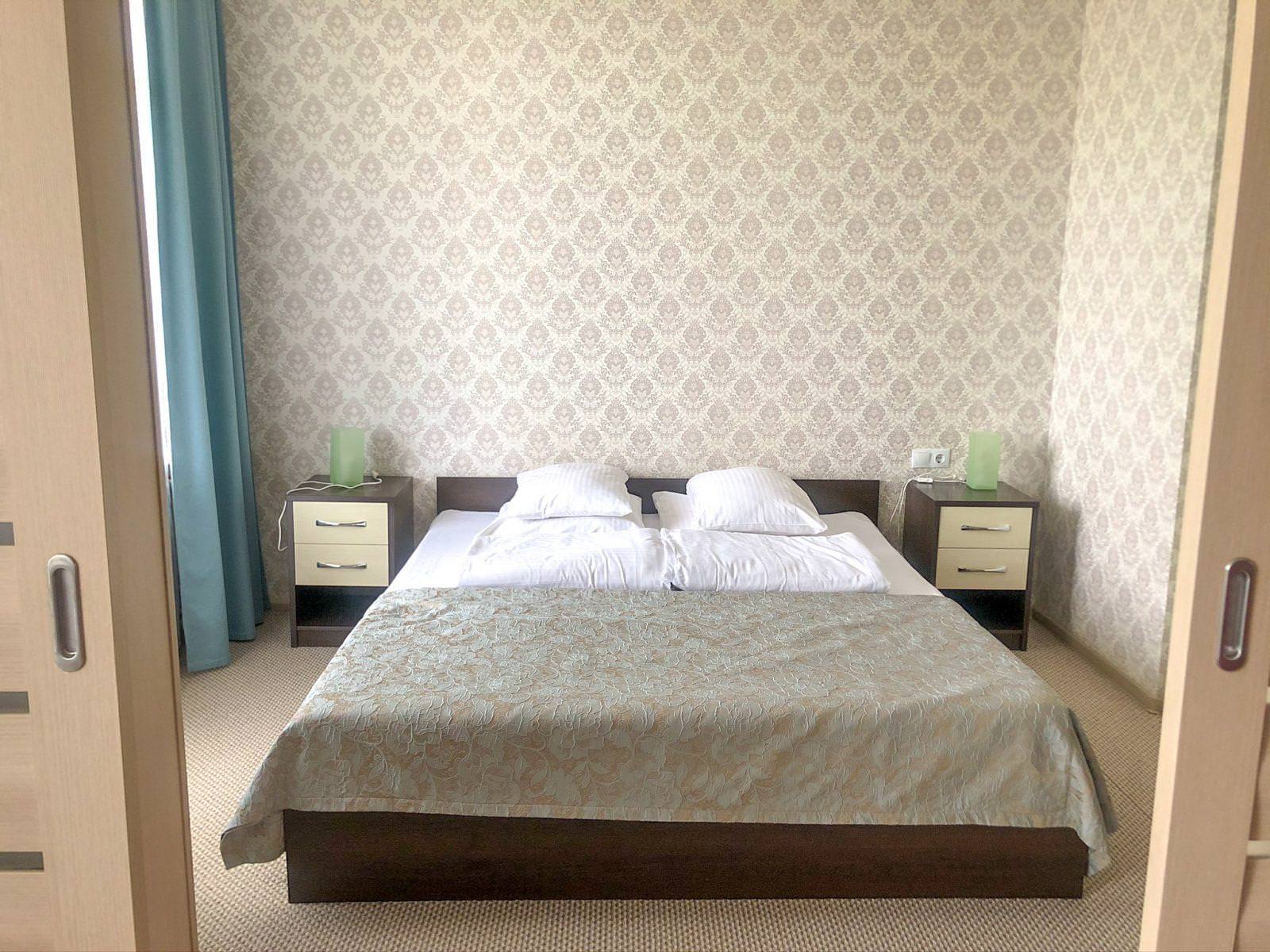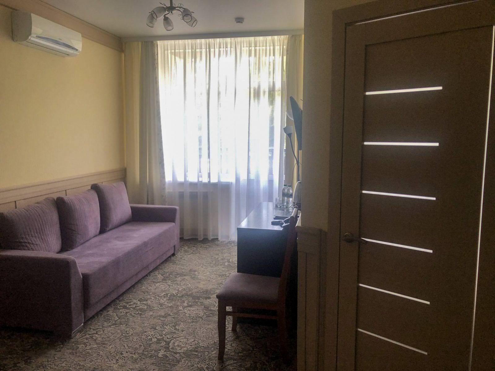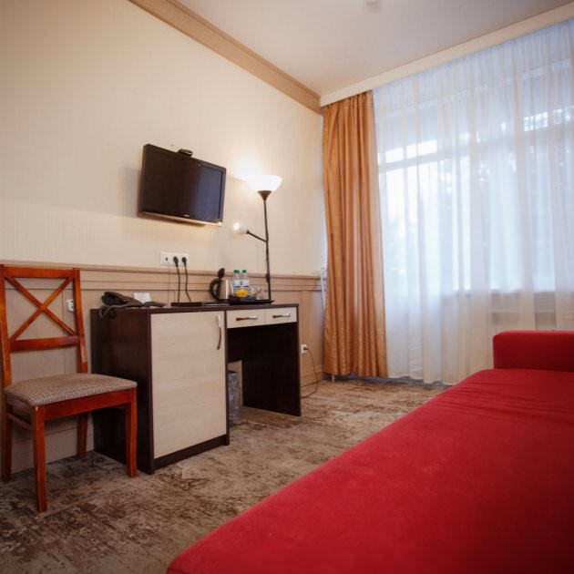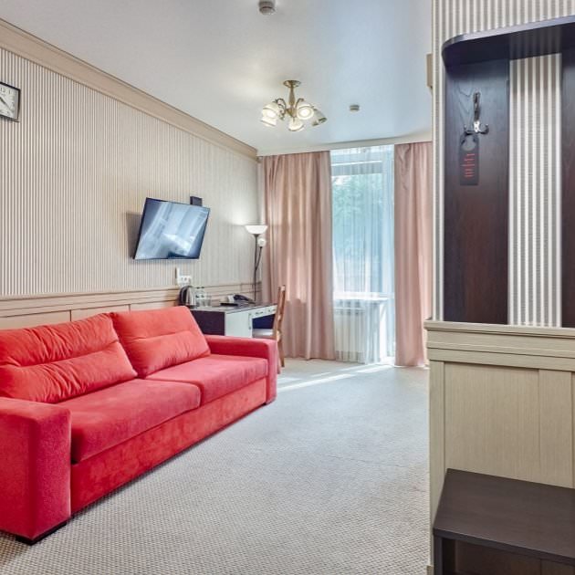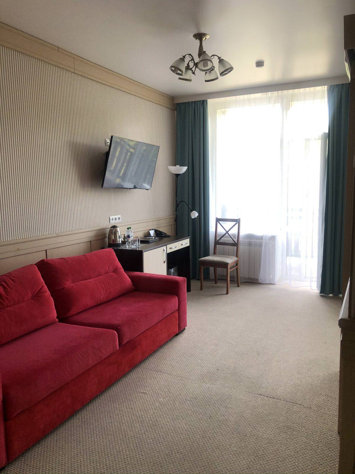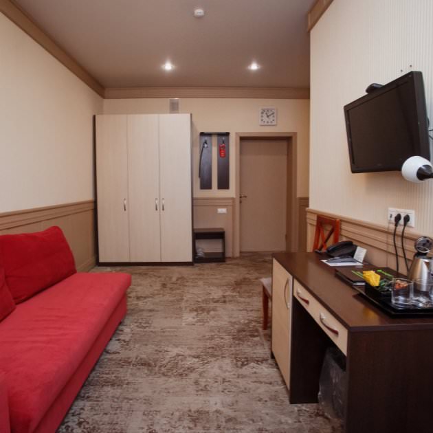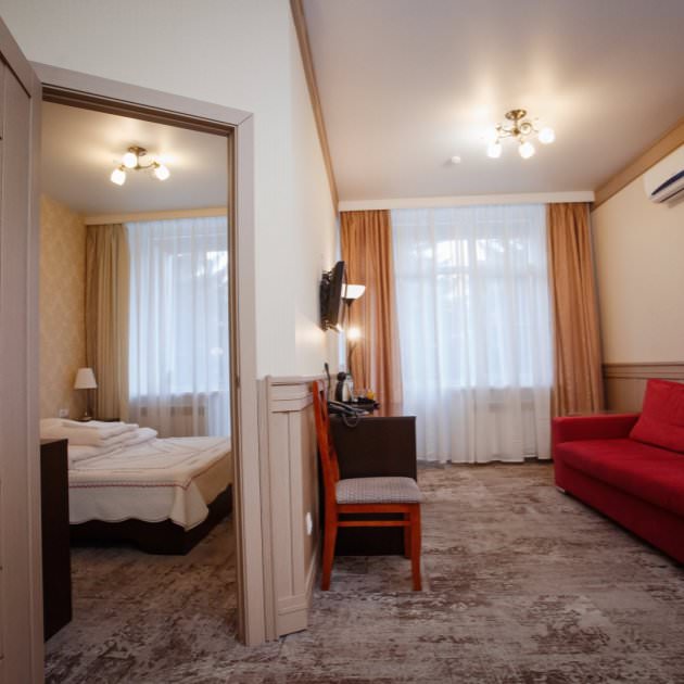В номере: две комнаты – гостиная и спальня, с одной двуспальной или двумя односпальными кроватями, балкон, кондиционер, TV, фен, шкаф для одежды, холодильник, чайник, телефон для внутренней связи, халаты, тапочки, средства гигиены. Удобный раскладной диван позволяет дополнительно разместить 1 взрослого или 2х детей. Есть возможность поставить детскую кроватку по запросу.